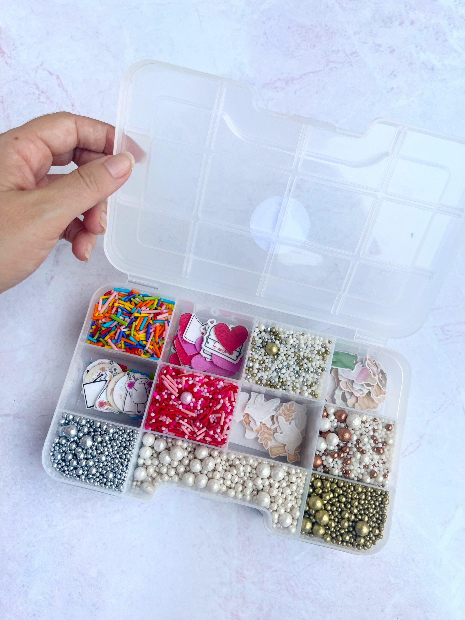 Cajita con variedad de decoraciones comestibles:
